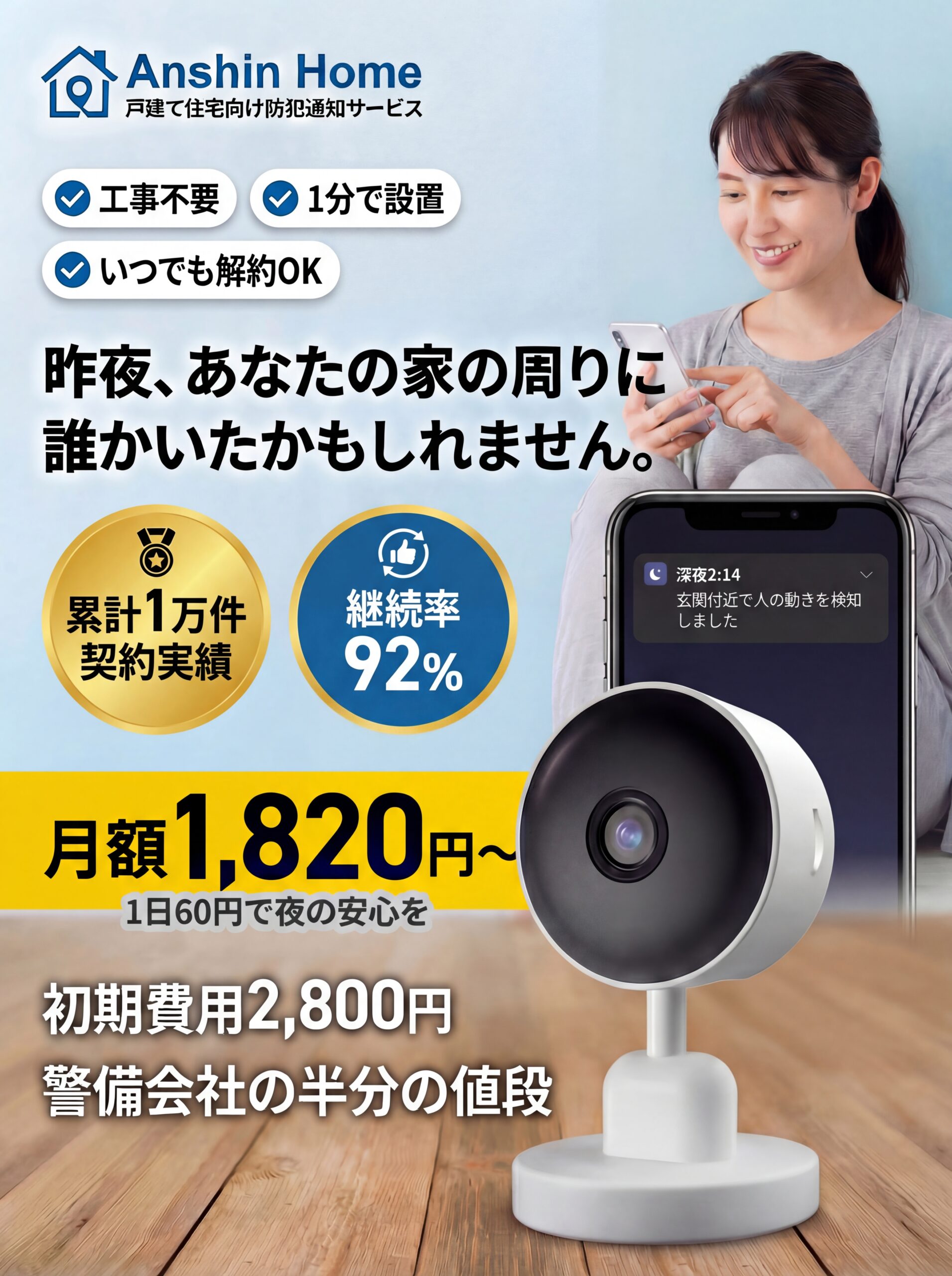 「自分の家は大丈夫」という常識が、通用しない時代になってしまいました。 最近ニュースで連日のように報道される、闇バイトやトクリュウによる強盗事件。彼らは下見を繰り返し、私たちが寝静まった夜間や、留守にしている隙を冷酷に狙ってきます。 かつての空き巣とは違い、今の犯罪は「鉢合わせても構わない」という凶悪なものです。事件が起きてから警備員が駆けつけたり、後から録画を確認したりするのでは、もう遅すぎる。 「今、自分の家の周りに誰かいる」 その異変に、その瞬間に自分が気づくこと。これこそが、最悪の事態を防ぐための唯一の手段だと私は確信しています。 私自身、このサービスを作ったのは、そんな得体の知れない犯罪への恐怖を、自分自身の家族に対しても感じたからです。大手のような高い月額費用も、面倒なネット設定もいらない。ただ、置きたい場所に置いて、異変をいち早く手元に知らせる。 「気づく」という、最も原始的で強力な武器を、すべての家庭に届けたい。 1台でも多くの安心を配り、この日本から「気づけなかった」という後悔を一つでも減らしていく。それが、この事業に込めた私の思いです。
